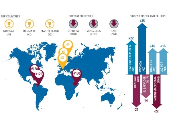 この「FM Global Resilience Index」では、各国ごとに「経済面」、「リスクの内容」、「サプライチェーン」という3つのカテゴリーに分けられた12の要素に関する評価結果を用いて、スコアが算出されている。本稿のトップに掲載した図は評価結果のサマリーであり、総合的な評価が最も高い順に1位がノルウェー、2位がデンマーク、3位がスイスとなっている。ノルウェーがトップになった要因としては、「経済的な生産性の高さ」「政治の安定性」「汚職の防止」や「コーポレート・ガバナンス」などが挙げられている。また経済の石油に対する依存度が減少していることも寄与しているようである。