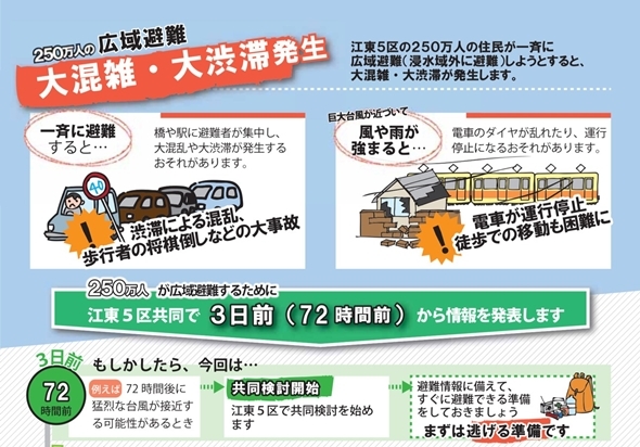 江東5区は人口が多い(約255万人)ので、住民が一斉に避難すると大混乱、大渋滞が起こるからです。早く準備をして、避難を開始しないと、逃げたくても逃げられない状況に陥りやすいのです。ですので、計画の立て方が3日前からと早いのが特徴です。