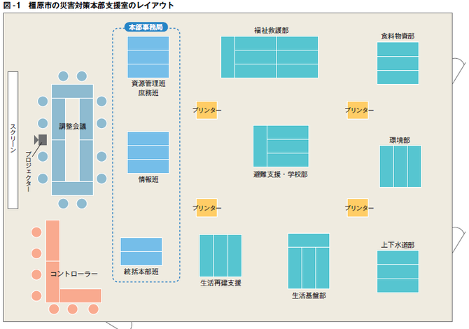 橿原市は、本庁舎が被災して使えなくなることも 想定し、市内の文化ホールに災害対策本部を設置す ることにしている。本部支援室のレイアウトは図1 の通り。別の部屋に、本部会議室が設けられること になっている。