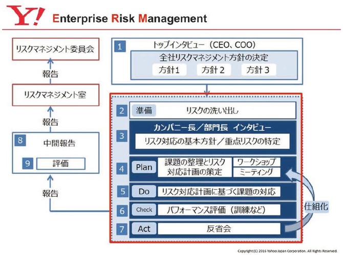 発生の可能性は低いが影響が大きく、部門単独では対処しにくいリスクについては、全社でも管理している。リスクをゼロにすることへ固執せず、ダメージコントロールが基本になる。影響の大きい「大規模システム障害」「広域大規模災害」「情報漏えい・データ破壊」の3つを特に注目し、同様の観点からヤフーグループ全体でも優先的に対応すべき「全社リスク対応方針」を「もれる・きえる・とまる」(情報流出・情報消失・サービス停止)と定めている。
