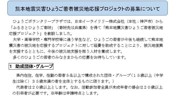 「熊本地震ひょうご若者被災地応援プロジェクト」が正式にスタートしました。昨日は、この事業の内容が兵庫県知事から公表されました。同時に、ひょうごボランタリープラザのホームページにもアップされ、公募が始まりました。