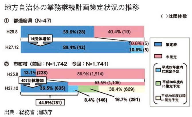 事業継続力を向上させる取り組みが伴わないのは民間企業だけではない。自治体はさらに深刻だ。総務省消防庁が今年1月に発表した自治体の業務継続計画の策定状況に関する調査結果では、都道府県は前回調査(2013年8月時点)で策定済みが28団体(59.6%)だったのが、今回調査では14団体増え42団体(89.4%)にまで高まった。今年度内にすべての団体で策定が完了する予定だ。ただし、岩手県、山形県、山梨県、沖縄県の4県に関しては、「継続的改善の取り組みはしていない」と回答。訓練の実施や職員向け研修もしていない県もあった。