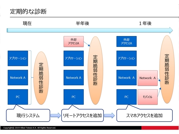 また、セキュリティ診断は定期的に行う必要があります。皆さんもご存じかと思いますが、マルウェア、標的型攻撃などの手法は常に進化しています。毎月、もしくは4半期に1回など定期的・継続的な診断を行い、脆弱性を知る必要があります。