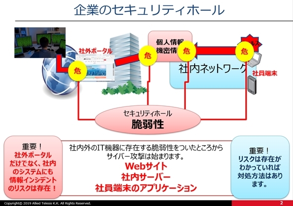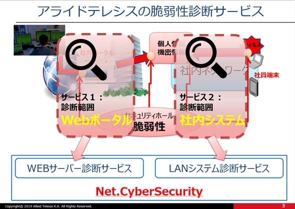 アライドテレシスでは4月にこのような外・内部の脆弱性診断サービスを「Net.CyberSecurity」というブランドとして立ち上げることを発表いたしました。この診断サービスを実施することにより、外側は社外Webなどの脆弱性、内側は社内サーバーやネットワーク機器などの脆弱性を診断し、セキュリティホールの箇所と直し方を知ることができます。