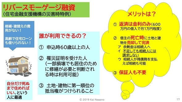 という具合に、本来なら家を快適にすることは諦めてしまう60代以上の方が災害時という条件を満たす事で使える、資本主義化の制度とは思えない優遇に、革命カードだ! と私は思っています(厳密には、通常のリバースモーゲージより、利息は高めの設定になってます)。