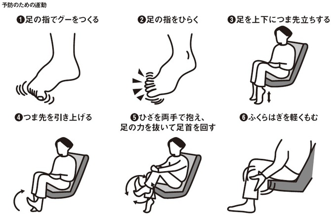 長時間同じ姿勢(車の中で座ったままなど)を続けないようにし、適度に足の運動(できれば歩行)をします。また、筋肉が血液を流すポンプの役目をしますから、日頃から足の筋肉(特にふくらはぎ)を鍛えておきましょう。