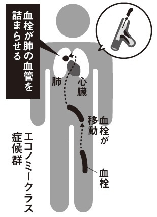 長時間足を動かさずに同じ姿勢でいると、足の血管(静脈)に血のかたまり(血栓)ができ、これが血の流れにのって肺の血管に詰まる(塞栓と言います)病気です。最初は大腿から下の足がむくんだり、赤く腫れて痛みを伴うことがあります。