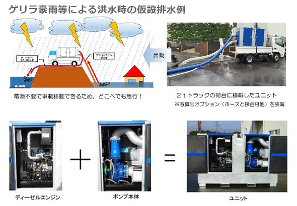 平常時の使用はもちろん、津波・高潮・河川氾濫・ゲリラ豪雨による浸水現場や冠水エリアの緊急排水、地下貯留ピットにたまった汚水や雨水の排水に役立つほか、工場・プラントなどで停電した時にも活用できる。また上下水道など工事現場での水替え工事、仮設排水、農業用灌漑用水のくみ上げにも使える。