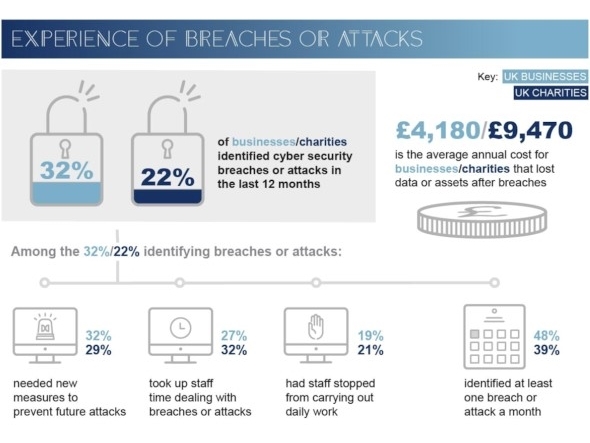 本稿のトップに掲載した図は報告書の3ページ目(実質的に最初のページ)に掲載されているサマリーであり、本調査に回答した企業の32%、慈善団体の22%が、過去12カ月の間にサイバーセキュリティに関する何らかの攻撃や侵害行為(breaches)を受けたと回答している。