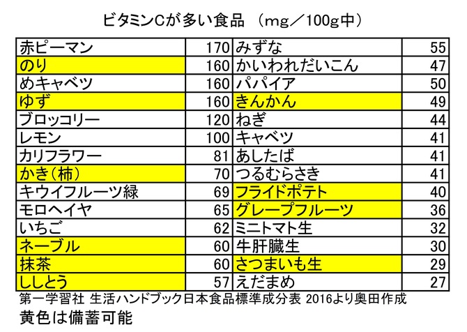 ところで、ビタミンCは体内でどんな役割をしているのでしょうか。脳で興奮系の神経伝達物質が働くときのお手伝いをするので、ストレスを解消する力を強めます。また免疫力、抗酸化作用も同時に高まります。ビタミンCは余分に取っても体内に貯蔵されないとこれまでいわれていましたが、副腎が高濃度のビタミンCを蓄えます。ですから、日頃の食事が大切で、健康を意識してしっかり野菜や果物を食べ、災害のストレスや免疫力の低下に打ち勝つことが大切です。備蓄に適した食品に黄色のマークを付けました。のり、じゃがいも、さつまいも、ししとう、果物では柿、ネーブル、きんかん、グレープフルーツ、ゆずなどは比較的長持ちします。