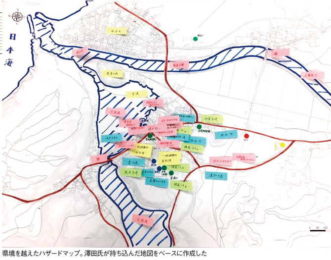 2015年3月には、双方集まって澤田氏が作成した地図を利用したDIG(災害図上訓練)を開催した。吉崎地区の3分の2は福井県に属するため、図上訓練を始めてみると福井県側から「福井地震の時はここが倒れた」「福井県吉崎町史には被害状況が罹れている」「ここは地盤が悪い」など活発な意見が出されたという。議論の末、県境を超えたハザードマップが完成したが、「まだまだ取り組みは始まったばかり。今年中に、このハザードマップを生かした合同避難訓練を実現したい」(竹本氏)。