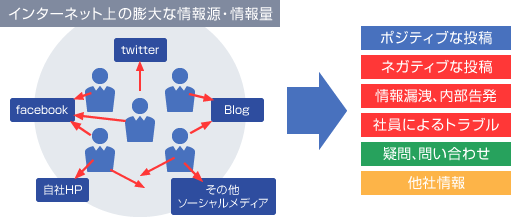 Facebookやtwitterなどのソーシャルメディアやブログ、2ちゃんねる掲示板などのWeb上の情報を収集し、ストーカー行為・殺人予告・執拗な書き込み調査を行うもの。事前に基準書を作成し、顧客にとって何がリスクとなるかをすり合わせ、問題のある投稿を発見した際にはマネージャーや事務所に電話やメールで緊急連絡する。特定のキーワードが含まれるから炎上では無く、言葉のニュアンスにより炎上を事前に察知するなど監視体制を整え、タレントのリスクとなり得る投稿内容をいち早く伝える。価格は初期費用10万~、月額10万円~で提供する(必要に応じ、ツール利用料が発生する)。