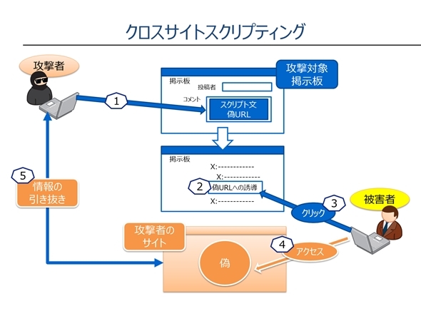 よくある例として、入力制限のかかっていない掲示板などにスクリプトを埋め込む手法があげられます。