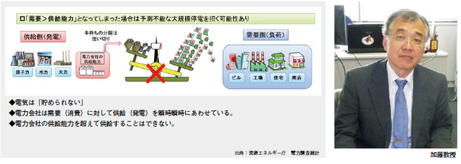 しかし、停電を引き起こすのは災害や事故だけとは限らない。東京電機大学の加藤政一教授は「停電 というのは、電気設備が壊れたときに起きるという イメージが強いかもしれませんが、東日本大震災以 前に日本で起きた最大の停電は、1987 年の夏に起きた東京電力の電圧崩壊と呼ばれるもので、このと きは、 災害や設備故障があったわけではありませんと語る。