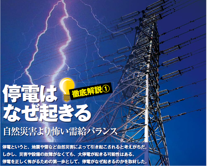 実は、この電力のバランスが、今まで以上にひっ 迫した状態になっている。福島第一原発の事故を機に、国内すべての原子力発電施設が停止している状 態で、今夏の電力消費量に対して、十分な電力の供 給量が確保できるかに電力各社は頭を抱えている。 問題は、このバランスが大きく崩れた場合だ。