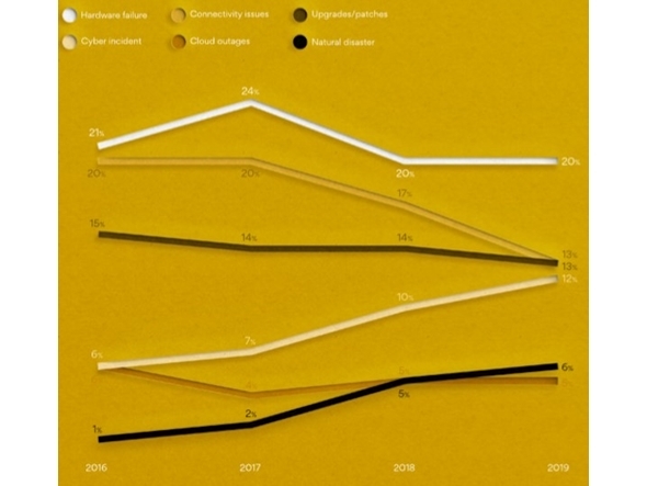 一方で「Hardware failure」(ハードウェアの故障)が2016年からずっとトップを維持しており、また「Upgrades/patches」がやや減少傾向とはいえ13%ある。これは恐らく、システムのソフトウェアなどのアップグレードや、不具合対策やセキュリティ対策のための修正プログラムを適用する際に発生したトラブルによるものと思われる。