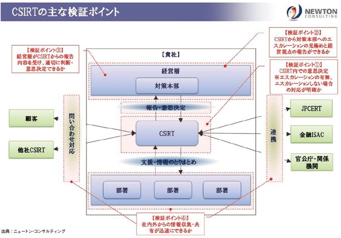 例えば、CSIRTから経営層にエスカレーションするかしないかの判断が明確に行えるか、経営視点に立った報告ができるか、など。経営層は、CSIRTからの報告を受け、適切に判断・意思決定ができるか、あるいは各部署で社内外からの情報収集・共有が迅速に行えるかも検証すべき項目とする。