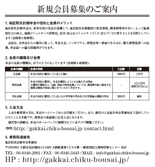 本学会では今後、産学官民の有志が連携して地区防災計画制度の普及啓発、調査研究を行うことで、地域防災力の向上や地域コミュニティの活性化、安全・安心なコミュニティづくりを推進していくことを目指しています。