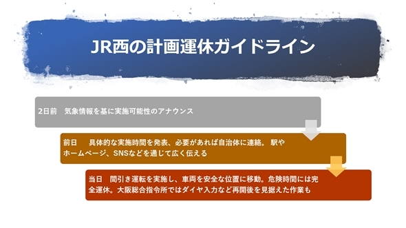 こうした中、2018年にJR西日本は「計画運休」に関する社内のガイドラインを策定した。「計画運休」が与える社会的影響や経営への影響などが大きく、社内においてこれまで蓄積されてきたノウハウを一定量は共有化し、標準化する必要性があったからだ。「計画運休」を実施する場合、気象庁やウェザーニューズ社からの気象情報を基に最接近の2日前をめどに実施するかもしれない旨を発表。前日には最終的な判断を下し、その内容を発表する。