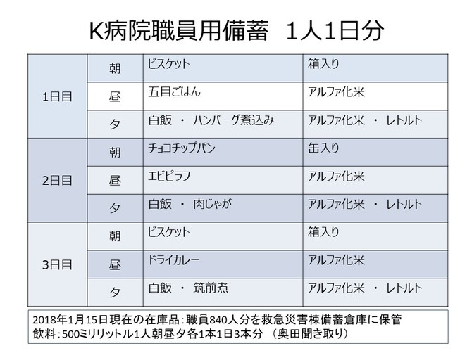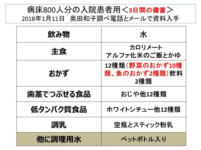 以上は患者用ですが、次いで病院の職員用に840人分を備蓄しています。これは大事なことです。1人1日3食、3日分で9食分です(表)。