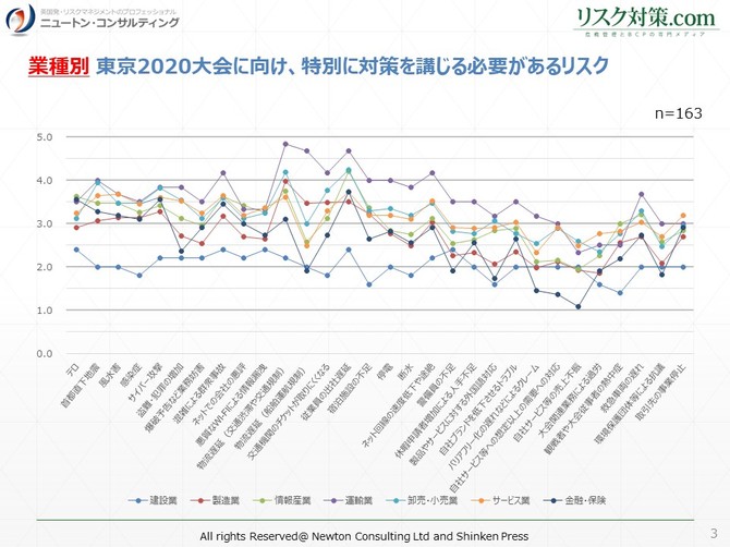 リスク対策.com(運営:新建新聞社)とニュートン・コンサルティング株式会社(本社 東京都千代⽥区、代表取締役社長 副島 ⼀也)は共同で、2020年に開催される東京オリンピック・パラリンピック競技⼤会(以下、東京2020⼤会)に向け、各企業が東京2020⼤会開催における影響をどのように考え、リスク対策にどう取り組んでいるのかアンケート調査を実施した。その結果、東京2020大会に向け、特別に対策を講じる必要があると考えていリスクとしては「物流遅延(交通渋滞や交通規制)」と「従業員の出社遅延」が最も高く、交通への懸念が高まっていることが明らかになった。東京2020大会の2年前となる昨年から行っている調査で今回は1年前時点での課題や取り組み状況を聞いた。開催直前となる来年も同様の調査を実施する予定でリスク対策の取り組みを経年変化を探っていく。調査は、ニュートン・コンサルティング株式会社とリスク対策.comのメールマガジン読者を対象に5月21日から6月3日までの2週間かけて行い、204の有効回答を得た。