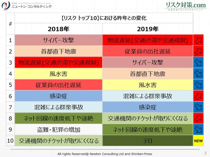 調査ではまず、東京2020大会に向け、各組織としてどのようなリスクについて特別に対策を講じる必要があると考えているかを点数により評価してもらった。その結果、トップ10には、「物流遅延(交通渋滞や交通規制)」「従業員の出社遅延」「サイバー攻撃」「首都直下地震」「風水害」「混雑による群衆事故」「感染症」「交通機関のチケットが取りにくくなる」「ネット回線の速度低下や途絶」「テロ」が入り、昨年と比べ、交通問題やサイバー攻撃など、より身近で発生可能性が高いリスクへの危機感が高まっている傾向が浮き彫りになった。