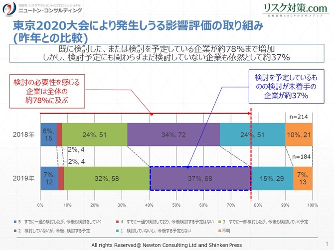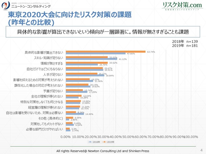 また、東京2020大会の開催により発生し得るさまざまなリスクの自社事業への影響について、すでに検討しているかどうかを聞いたところ、「すでに検討している」と回答した企業は全体の約41%に上り、昨年より約9ポイント増加。「検討していないが、今後、検討する予定」を併せると、全体の8割近くは検討が必要だと認識していることが明らかになった。一方で、東京2020大会まで1年に迫った現時点において、「検討していないが、今後、検討する予定」との回答が約37%と最多を占めたことについては、対策のスピードが今後の課題となる懸念を残した。