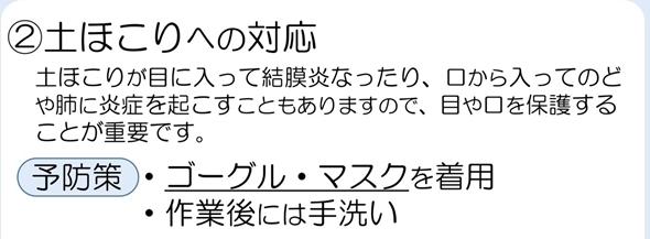 さらに、上記、厚生労働省の「清掃作業をされる方へ」というPDFでは、土ほこりの結膜炎対策として、マスクだけではなくゴーグル着用を呼びかけています。