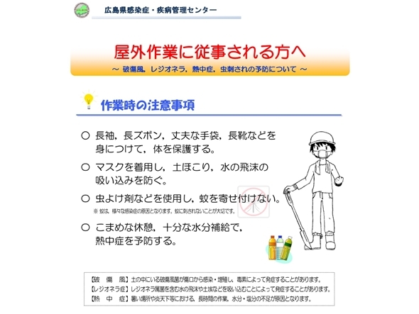 また、国立感染症研究所 感染症疫学センターは、平成30年7月豪雨(西日本豪雨)に関する感染症関連情報として、災害そのものに起因する感染症の例を挙げ、破傷風、レジオネラ菌の他に、レプトスピラ症についても注意を呼びかけています。
