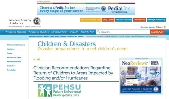 タイトルは、「洪水やハリケーンの影響を受けた地域への子どもの帰還に関する臨床医の勧告」とあります。