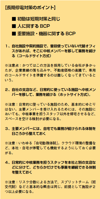 電力の復旧がいつになるか見通しがつかないような長期の停電に対しても、初動は「短期停電」と基 本的に変わりはない。しかし、長期化すると分かっ た段階で、 「人」に関する BCP と、重要施設・機器 に対する BCP の両面から検討を開始することにな るという。
