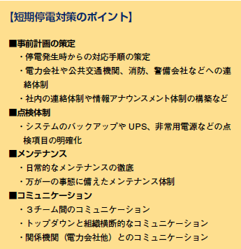 「停電だけでなく、ネットワークの切断や、施設が使えなくなった場合など、年間を通じてさまざま なシミュレーションを実施し、計画の実効性を高めていくことが重要です。実際に場所を移してオペ レーションをしてみるようなことも大切でしょう」 (同) 。