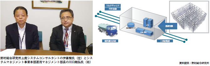 野村総研では、企業の事業継続には欠かすことが できないデータセンターを運用している。同社シス テムマネジメント事業本部運用マネジメント部長の 川口剛弘氏は「データセンターは、電気が命。電気 が止まったらデータセンターとしての意味がありま せんから、継続的な電力の供給を行うべく 2 重 3 重 の停電対策をしています」と語る。