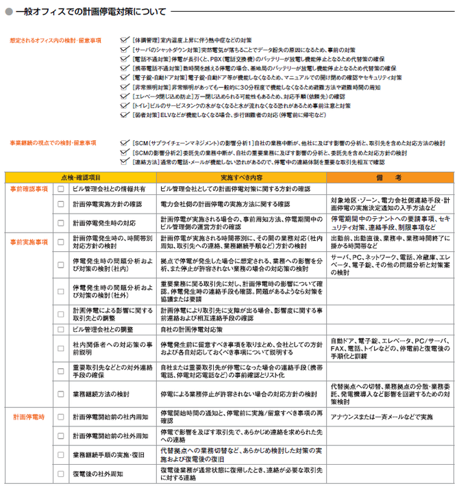 これらの対策に加えて、ビルの管理会社とは、事 前に計画停電に対する方針を確認しておくべきだと する。 例えば停電期間中のテナントへの要請事項や、 セキュリティ対策、連絡手段、制限事項など。これ についても計画停電としての対策に限らず、不意の 停電時においても役立つことが期待される。