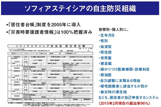 ソフィアステイシア(マンション)には、309 世帯、約1000 人が居住している。2003年に新築分譲されたこのマンションには、マンション管理組合とマンション自治会、さらに管理組合と自治会の合同編成組織になるソフィアステイシア自主防災会というのがある。居住者は100%加入している。