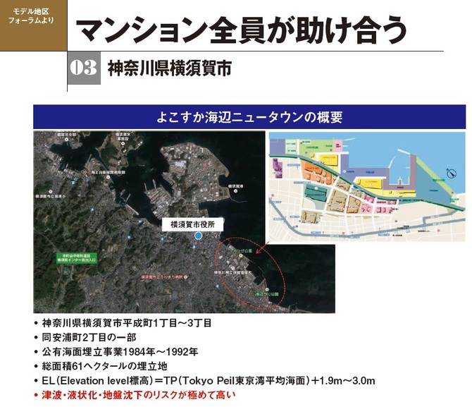 よこすか海辺ニュータウンは海岸から約200mなので、津波が来れば一発で流される場所にある。全体が1992年に埋め立て事業が完了した61haの埋立地で、東京湾京浜海岸から1.9mから3mほど上がった場所。最大震度は7と想定され、長周期地震動による揺れの増幅も懸念される。津波浸水は到達波高で4m。さらに、液状化現象に伴う地盤沈下、船舶・車両・建物瓦礫などの津波漂着物による津波火災も懸念される。