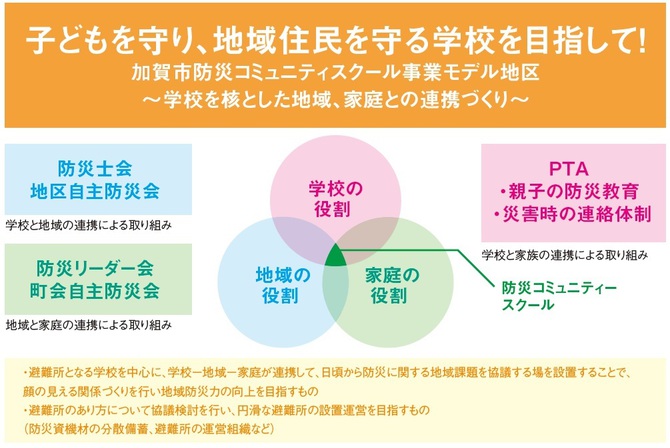 三木地区自主防災会の規約の第2条「目的」には、未来に向かう子どもたちに、適切な行動と判断力がとれる防災教育をする旨が明記されている。この自主防災モデル事業は、子どもを大事にしていくことが大きな目的だ。東日本大震災のときに、「釜石の奇跡」があったが、子どもが逃げていく姿が大人を助けた。子どもが動くことで、大人がそれに引きずられて動く。やはり子ども中心のものをきちんとしていかなければいけない。加賀市では、「加賀市防災コミュニティースクール事業モデル地区」を設定し、地域、学校、保護者連携でやっている。三木の自主防災活動もこの中に関わっている。