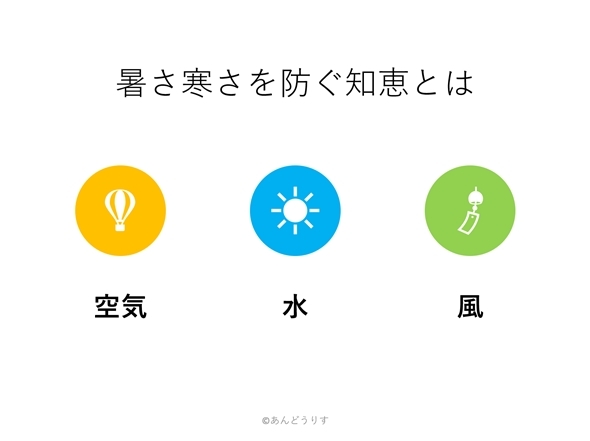 寒さ対策はわかっただけでは、夏の対策はできないと思っている方もいますが、そんなことはありません。すべてを逆にすれば、暑さ対策になるからです。