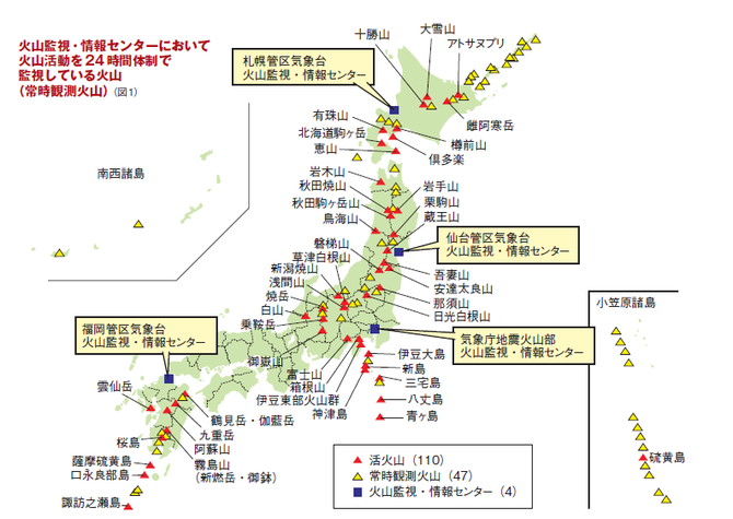 2003 年1月、 火山噴火予知連絡会 は、 「おおむね1万年以内に噴火した火山、 および現在活発な噴気活動の ある火山」 を活火山と定義し108 を指定した。 2011 年(平成 23) 6 月に新たに 2火山が選定され、 現在国内の活火山の数は 110となっている (図1) 。