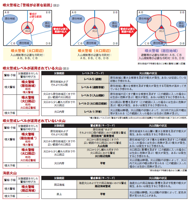 噴火警報の名称は、「警戒が必要な範囲」が火口周辺に限られる場合は「噴火警報(火口周辺)」「警戒が必要な範囲」が居住地域まで及ぶ場合は「噴火警報(居住地域)」として発表し、海底火山については「噴火警報(周辺海域)として発表する」(図3)。 噴火警戒レベルが運用されている火山では、あらかじめ地元の火山防災協議会で合意された基準に沿って、気象庁は噴火警戒レベルを付して噴火警報予報を発表し、地元の市町村等の防災機関では必要な防災対応(入山規制、避難勧告等)がとられることになっている。 2009年(平成21)6月には、年今後100年程度の中長期的な噴火の可能性および社会的影響を踏まえ、「火山防災のために監視観測体制の充実等の必・要がある火山」として47火山が選定された。