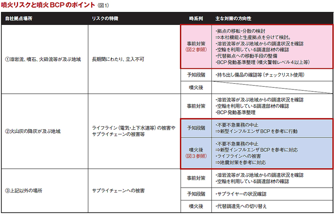 日本国内の活火山についてはハザードマップの整備が進んでおり、火山近辺の自治体では、避難計画などの策定を進めている。ただし、降灰など広域に影響が及ぶ事象については具体的な対策まで踏み込めていない。 一方、企業についても、富士山周辺の一部の企業で、噴火の予兆があった際の避難方法や代替拠点の把握など、初動対応を中心に簡単なルールを定めている程度で、BCPの観点から噴火対策を整理している企業はほとんどないのが現状だ。