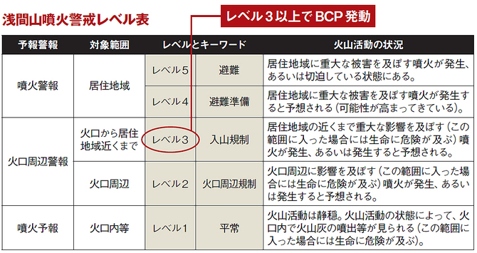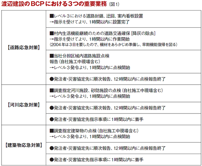 渡辺建設では、2008年12月に浅間山噴火を想定したBCPを構築した。火山噴火は、地震に比べ前兆がとらえやすいことから、同社では、気象庁による活動警報レベルをもとにBCPの発動基準を設定している。原則として、警戒レベル3「居住地域の近くまで重大な影響を及ぼす噴火が発生、あるいは発生すると予想される」以上の状態となったら、社長をトップとした災害対策本部を本社内に立ち上げ、全社員が自主的に参集することを決めている(次ページ「浅間山噴火警戒レベル表」)。 しかし、噴火の状況によっては、全社員の参集が難しいことも考えられるため、同社では、比較的被害が少ないと考えられる地域で、さらに会社から1キロ圏内に住む社員を緊急要員に指定。交通網が仮にストップしても緊急要員を中心に初動にあたれる体制を整えている。重要業務は、道路、河川、建物 同社のBCPにおける重要業務は、主に、道路応急復旧、河川応急対策、建物応急対策の3つ。業務ごとの具体的な活動と目標時間をまとめると図1のようになる。