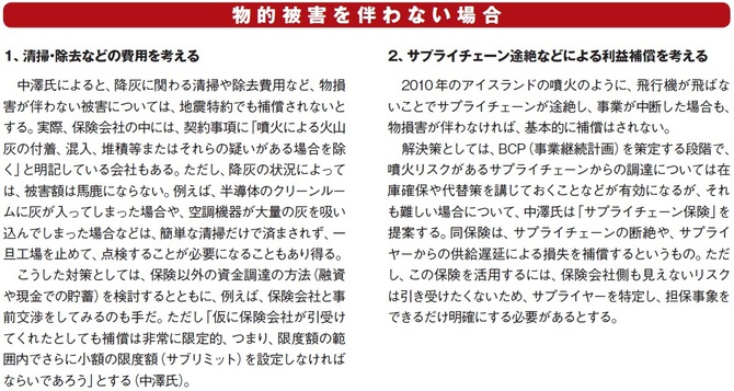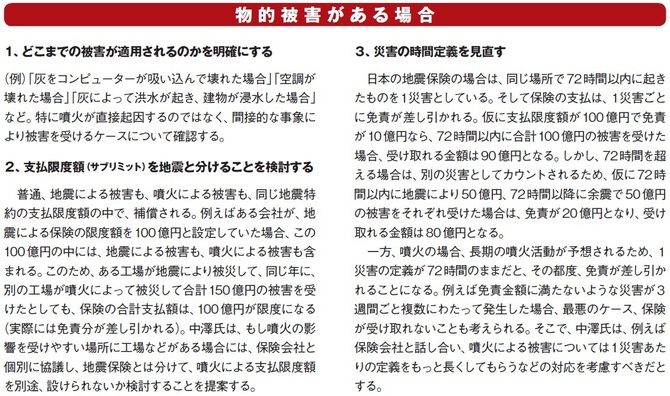 さらに、火山噴火の場合は「降灰により停電が起き、長期の間、生産活動ができなくなる」「航空機が飛ばなくなって部品等の調達が途絶える」など、物損害を伴わない被害も考えられる。 中澤氏によれば、事業の中断による営業や生産活動の停止などによる売り上げの減少は、地震特約に「利益損失の補償」を追加していないとカバーされない。注意が必要なのは、「利益損失の補償」に関しても、物損害が出ていない場合には、補償範囲には含まれないということだ。 以下、物的被害が出る場合と、物的被害を伴わない場合について、保険上で考慮すべき点をまとめてみた。