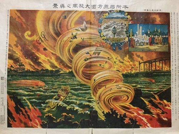 関東大震災の発生時刻は午前11時58分とちょうどお昼時でした。当時の調理器具の中心は七輪とかまど。倒壊した家屋や倒れた家具などの木材がそれらに触れ、容易に火事が各地で起こりました。その火事を延焼させたのが、当時、日本海沖を通過していた台風です。でもこの台風は日本に上陸していないのです。上陸していなくても台風は、被害をもたらすことがあります。日本海沖を抜ける時、関東平野では、暴風が吹きつけます。最初南風が風速10〜15メートルで吹き、そして台風の進路に伴って風が北風になり風速22メートルになったため、各地で火災が延焼し被害を拡大させたのが関東大震災でした。