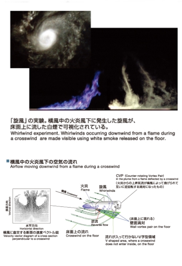 そこでわたしたちは、火災域の風下に発生する旋風の発生を予測できるよう、その性質・発生メカニズム・発生条件を、さまざまな規模の実験をとおして調べています。 これまでの実験で、火炎風下の床面(地表面)付近には、旋風の源ではないかと思われる数種類の渦が発生していることがわかってきました。さらに、これらの渦の形成過程には、横風に逆行する空気の流れなど、火炎風下の複雑な流れが関与していることなども明らかになりつつあります。