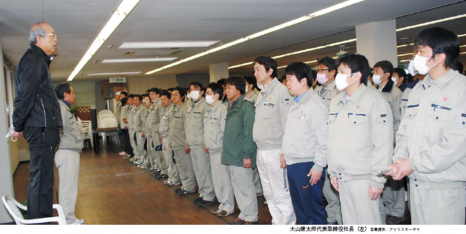 震災当日、千葉県幕張市の展示会を訪れていた代表取締役社長の大山健太郎氏は、震災発生後すぐに仙台の本社に戻ることを決意。翌々日の13日には角田工場に到着し、従業員の安否や、製造・物流面での被害状況を確認した。社員こそ無事だったが、県内沿岸部は津波の被害が大きく、また親類や知人に犠牲者や行方不明者が出たという社員も多く、すぐに仕事に集中できるような雰囲気でなかった。