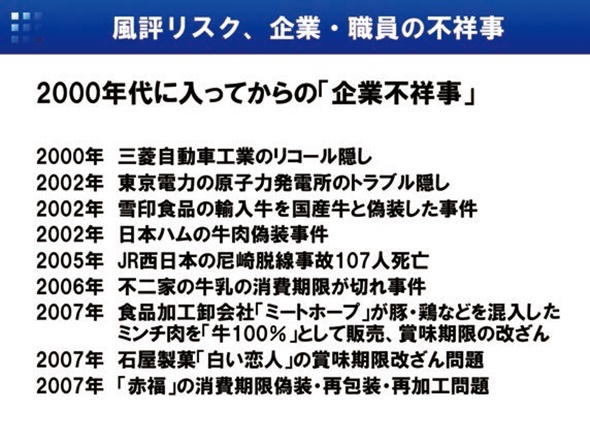 風評被害という言葉が企業との関係で取り上げられたのは、2000 年に起きた雪印乳業の食中毒事件です。食中毒の原因は黄色ブドウ球菌ですが、当時の幹部が「私も寝てないんだ」と発言し、その映像がメディアで流され続けたこともあり業績が悪化し、事件の3年後に会社の形を変えました。これは人の命がかかわる安全の問題であり、謝罪や責任を求められる事態になった事例です。