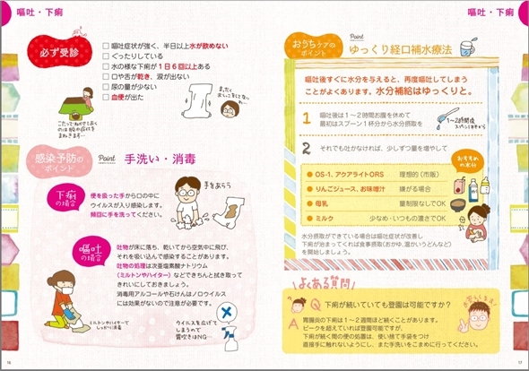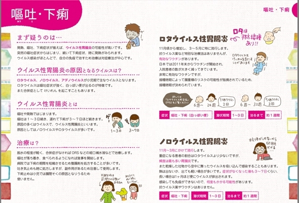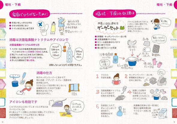 ノロウイルスをはじめ、おう吐下痢症は、避難所でも実際に多く発生しています。発生してしまうと、医療体制が脆弱になる災害時、乳幼児や高齢者にとって、命にかかわる病気にもなってしまいます。ノロウイルスはアルコールで死滅しないので、次亜塩酸ナトリウム(塩素系漂白剤)が必要になります。子育て世代にかかわらず、経口補水液の作り方やゲーゲーセットの作り方の対処法についてわかりやすく説明されているこのページは避難所運営必読のページかと思います。