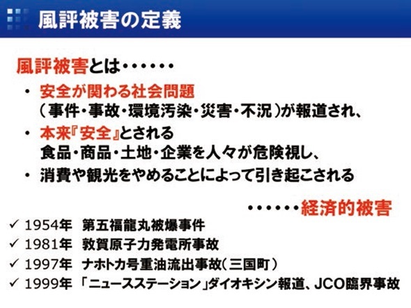 1990 年代後半に風評被害という言葉が市民権を得るようになり、2000 年代には企業でも風評被害という言葉が扱われるようになりました。当時は不況で生命保険会社や証券会社が潰れ、東洋経済や日経ニュースなどビジネス雑誌で書かれた「危ない企業リスト」という倒産の可能性がある企業のランキングが話題になった時期です。これが風評の発信源として問題になっていったのが2000年代の初頭です。2002 年にペイオフ解禁になると銀行が潰れるかもしれないとささやかれ、金融庁の特別検査が入るだけで「あの銀行は危ないんじゃないか」と思われ、それだけで預金が流出してしまうケースもありました。これは金融庁発の風評被害として問題になりました。