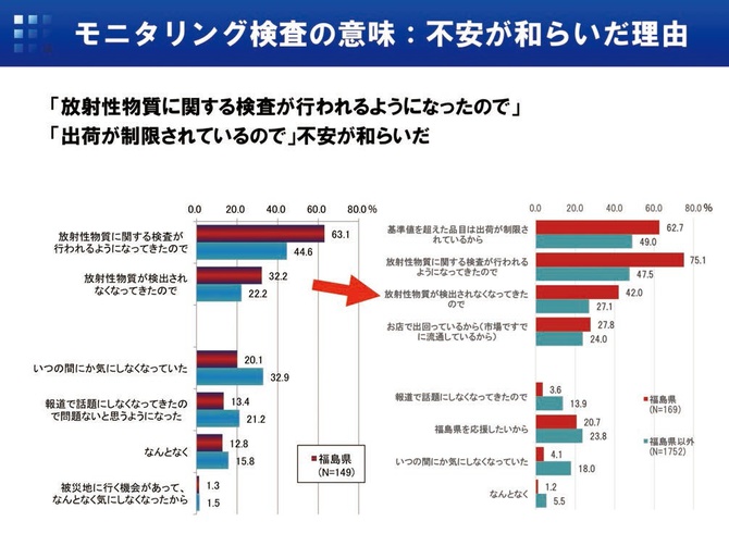 このように、この風評被害は大規模災害後の復興課題、社会問題の1つなのです。これだけ悪いイメージが5 年間の間で固定化してしまったので、福島県産の農産物は首都圏のスーパーから消えたままです。全国的にも同じ状況です。福島県産の農産物は安全なのに流通構造が変わってしまい他の産地に棚を取られて戻らなくなっています。